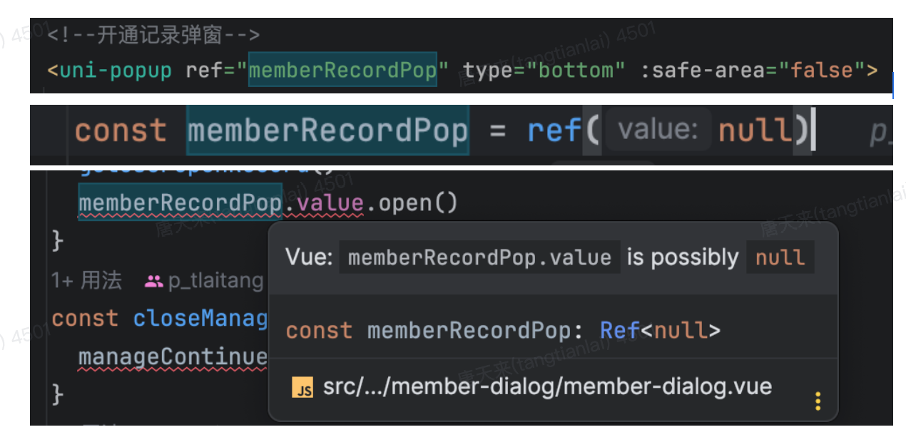 在使用uni-popup对组件进行方法使用的时候,使用了ref的绑定。在使用popup的方法的时候先对ref绑定了初始化的值,然后再根据值的true或者false对popup进行显示和隐藏的操作。这时候编辑器ts类型检查会对类型进行报错警告,如何解决该问题。