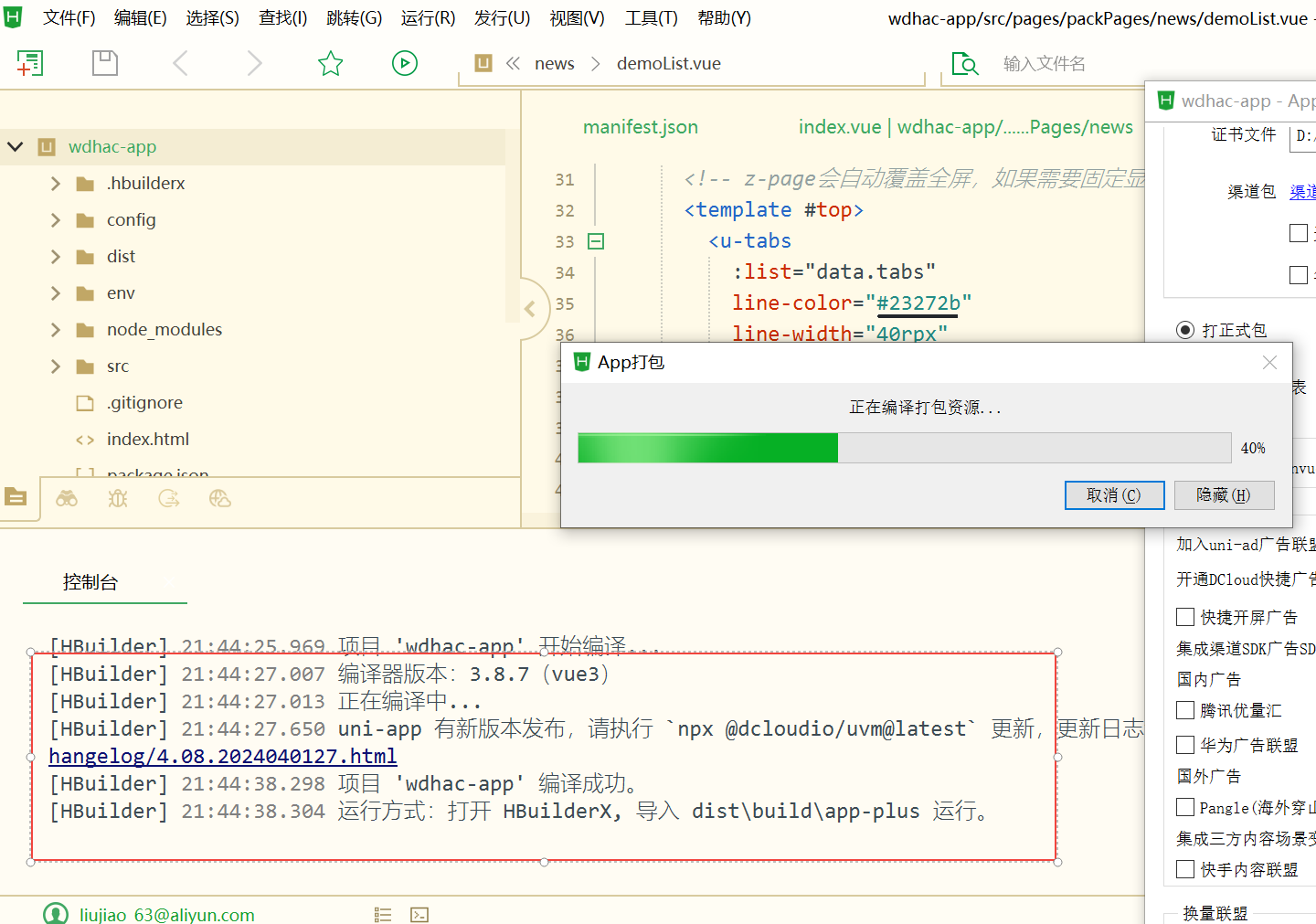 uni-app v3版本 hbuilderx 4.08,打包停留40%后无反应 ;控制台也编译成功;后面没有任何反应
