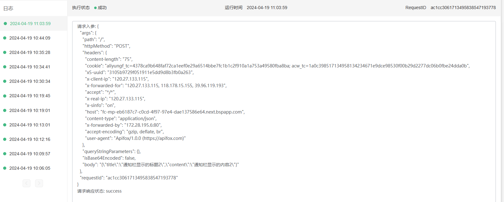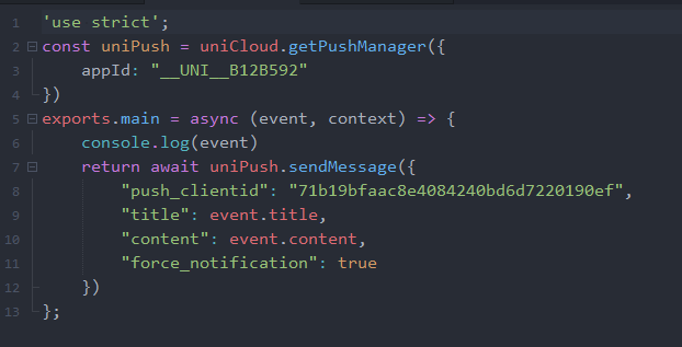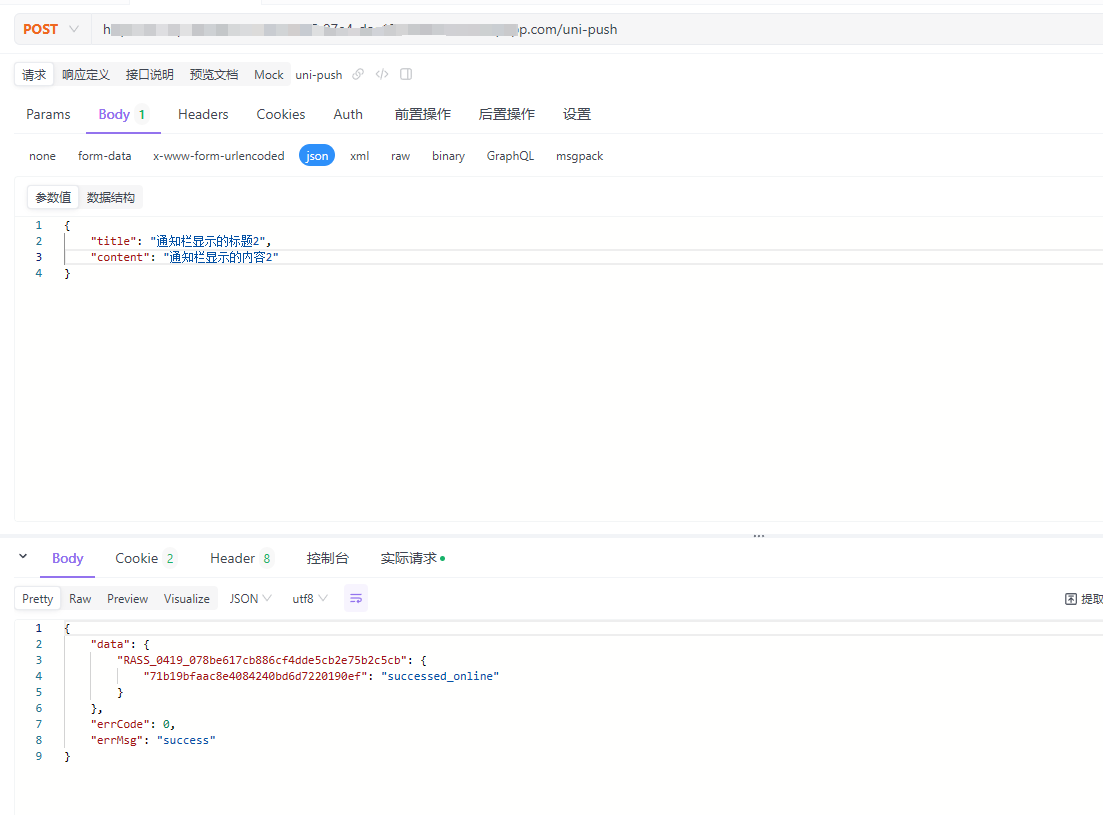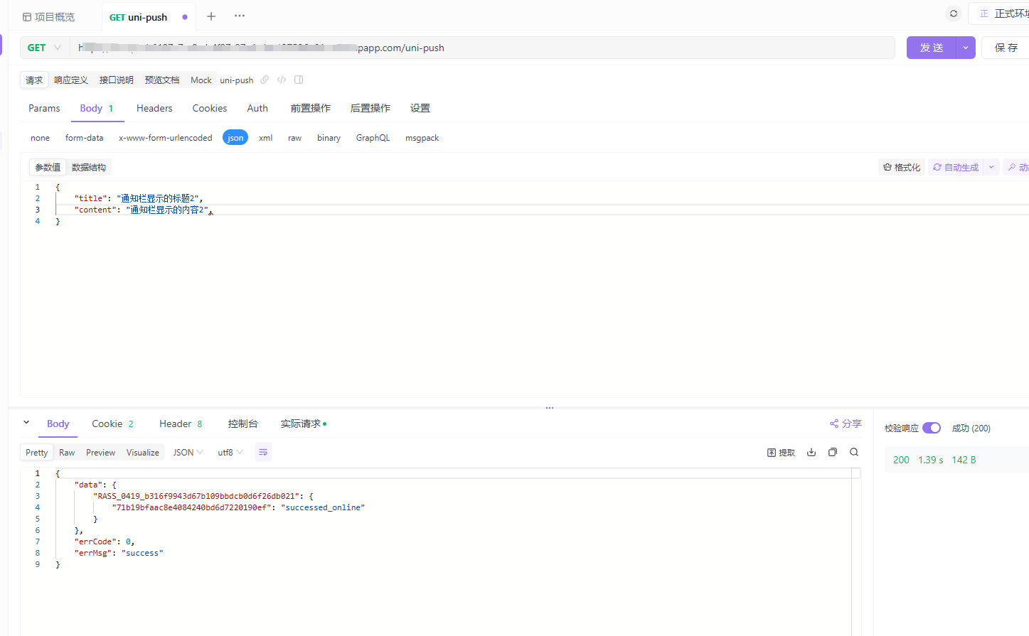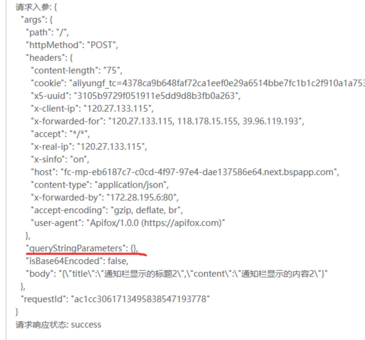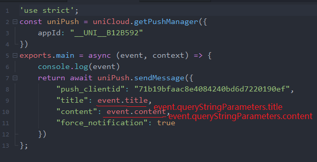 在将unipush云函数url化后在api工具中调用,传过去的参数接收到了但是没有消息通知 是否是我的参数有问题 这是云函数的js文件,每次更新都有重新上传部署,本地运行函数是没有问题的,把title content字段写成固定字符串用测试工具调用url也是可以触发消息推送的,就是我带上参数就没有反应