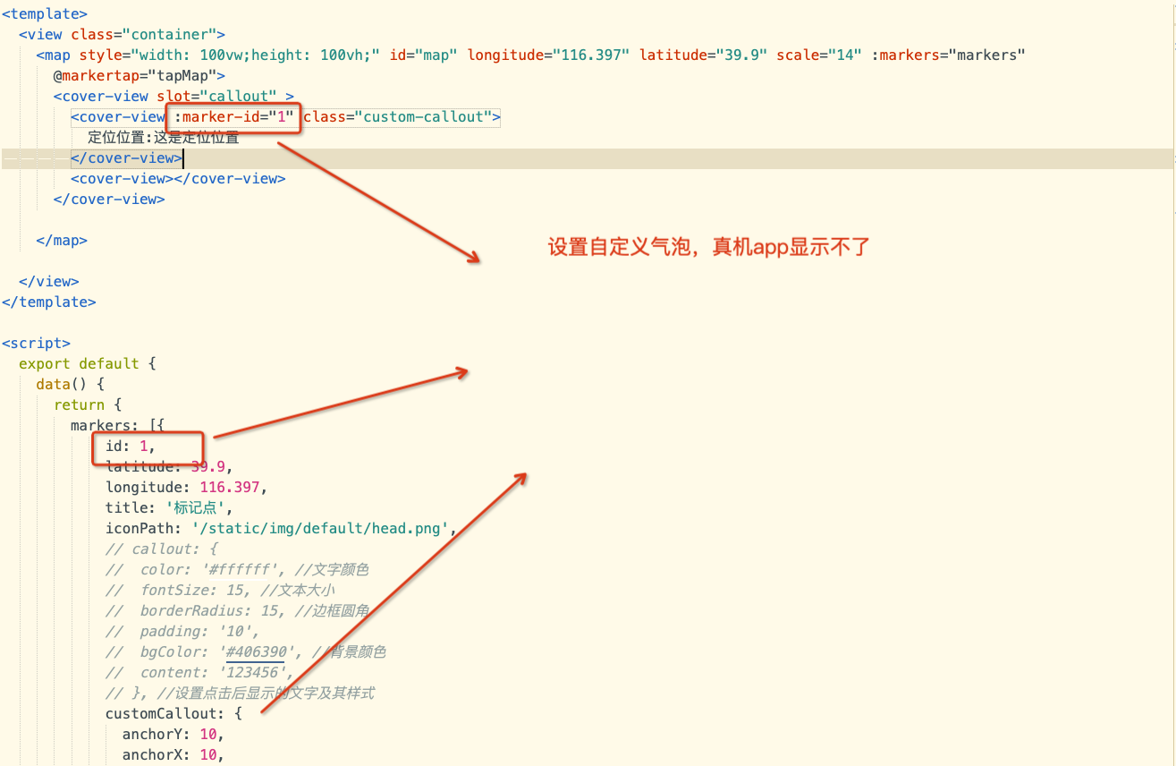在map组件中添加自定义插槽(customCallout)显示不了,换成callout可以显示。请问自定义气泡怎么添加???????????????