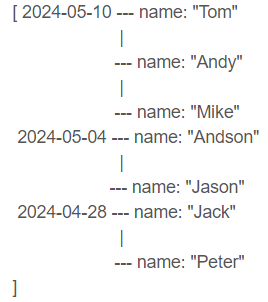 回复 zZZ1Ma: 但我怎么去循环呢,我是想在uniapp页面上第一行显示一个日期,然后下面跟着显示跟这个日期有关的name,然后再显示一个日期,再显示一组跟它有关的name。像你写的这个数据格式,怎么来对应呢