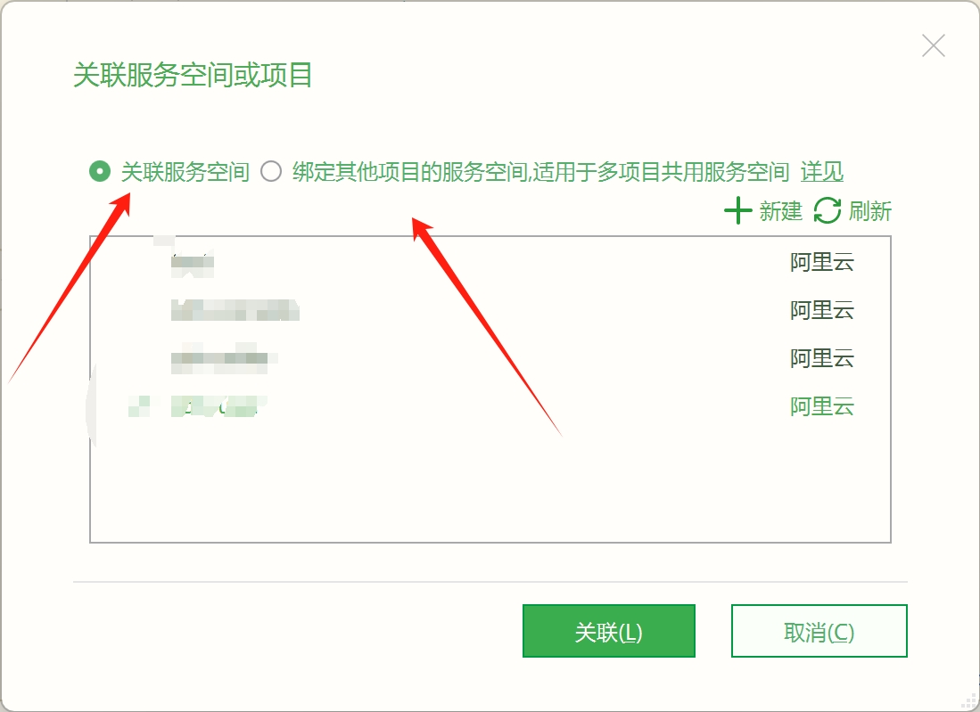 ok,那我就绑一个吧 主要还有一点不清楚,像图里面的关联,绑定,和初始化有什么不同? 这样操作有问题吗: 1.买个云服务空间 x 2.创建项目a, b, c 像图1,将项目a, b, c分别用云空间x初始化 像图2,将b,c项目绑定到主要项目a中 完结。。。 问题:那么图2的关联选项需要用吗?这个步骤有没有问题