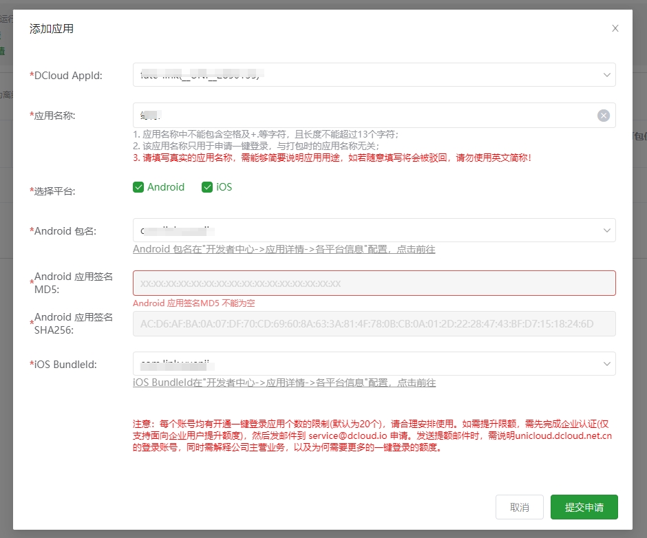 想开通应用APP一键登录,提示MD5必填,但是输入框是禁用状态,证书用的云端
