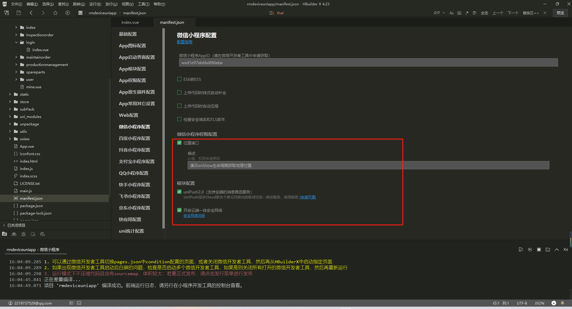 使用hbuilderx开发微信小程序 勾上manifest.json里边的消息推送服务之后 就报错