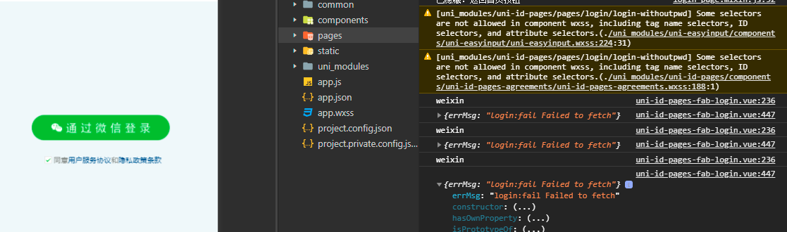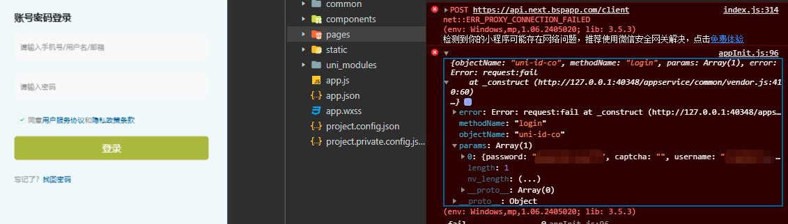 在微信开发者工具中跑小程序(绑定的是个人的小程序) 通过微信登录,返回 errMsg: "login:fail Failed to fetch" 通过账户登录 返回 request:fail (如果在浏览器里访问是账户登录的) 在微信小程序后台已经将下面两个域名放入Requst合法域名中 https://api.bspapp.com https://api.next.bspapp.com 请问如何解决