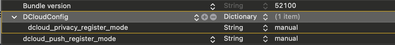 在云端打包出的info.plist文件里面,找到了 DCloudConfig 这个节点下有一个 dcloud_privacy_register_mode 设置为 manual