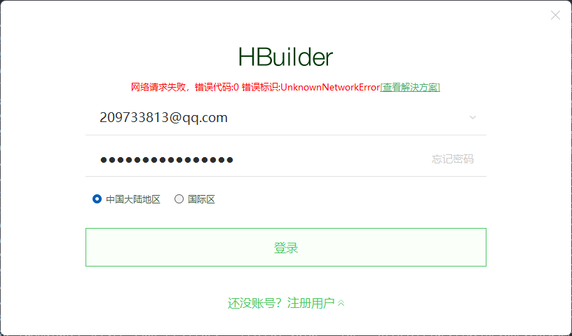 2024-10-23 09:14:48.055 [WARNING:] http request: QUrl("https://ide-global.dcloud.io/client/http/user/login") , connect to server error, errorCode: QNetworkReply::NetworkError(UnknownNetworkError) , httpCode: 0 , httpReason: ""
