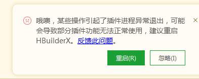 哦噢,某些操作引起了插件进程异常退出,可能会导致部分插件功能无法正常使用,建议重启HBuilderX.。