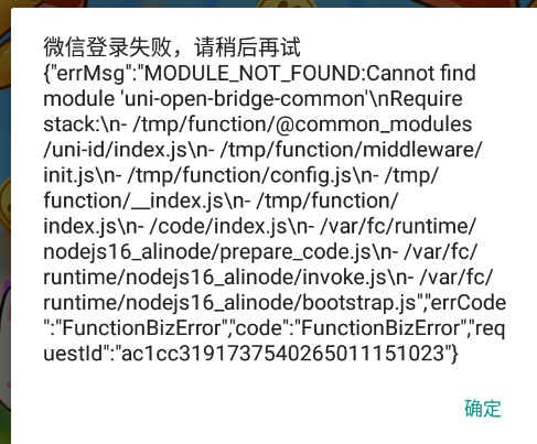 网赚游戏微信登录报错 有安装uni-open-bridge-common公共模块