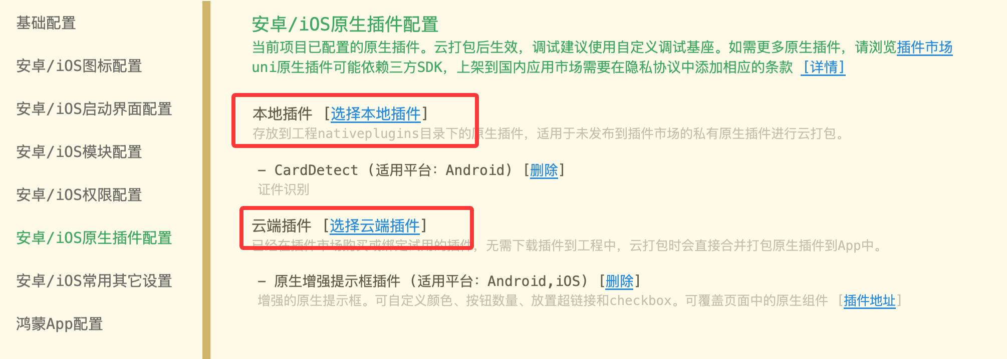 manifest.json中 原生插件配置代码如下, "nativePlugins" : [