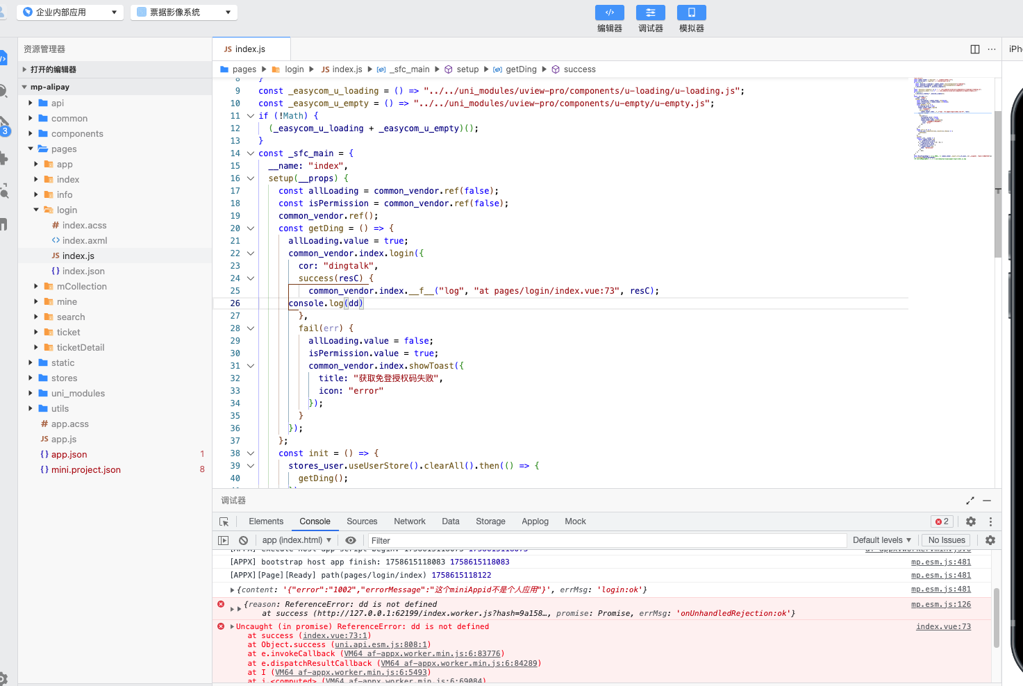 回复 DCloud_UNI_JBB: 无论vue2还是vue3我都无法预览,目前还有新问题:调用uni.login有报错,查看报错信息是默认我是支付宝了,同事的电脑(m1芯片)是没有问题的可以读取到dd