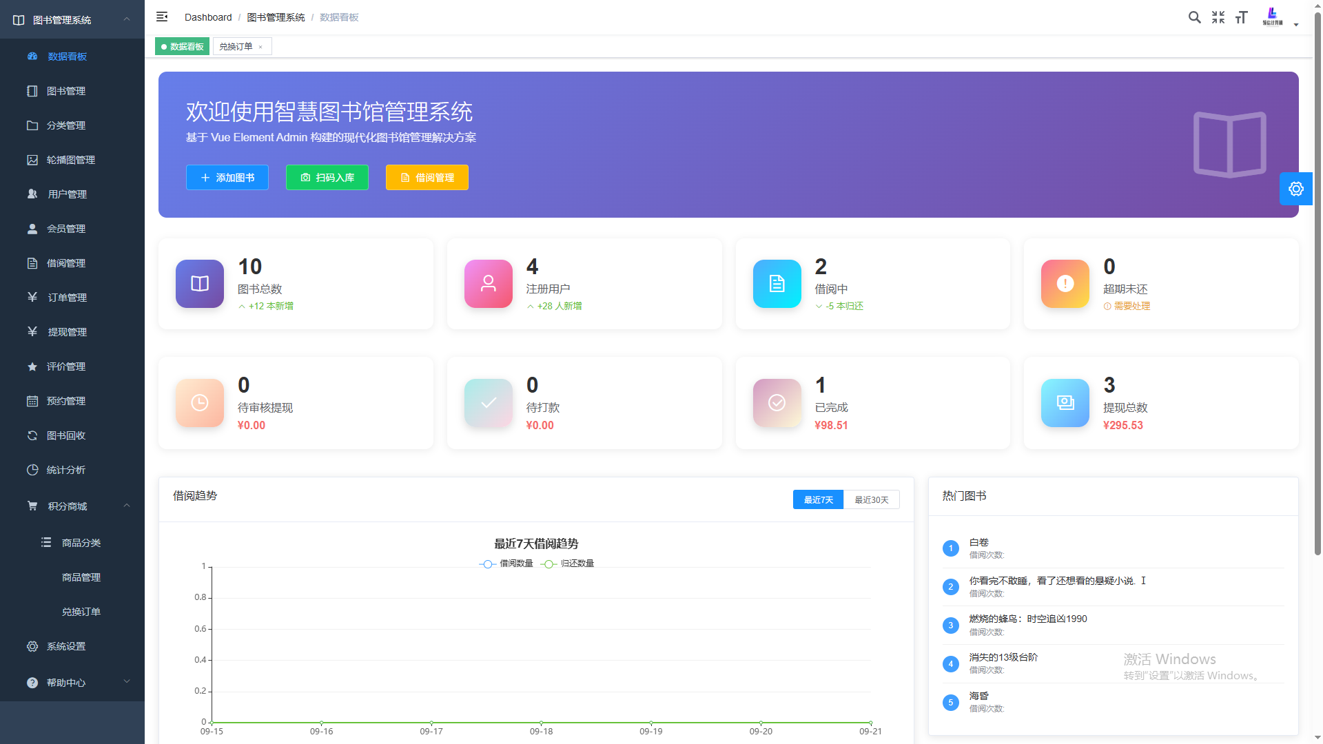 这是一个完整的图书借阅管理系统,采用前后端分离架构,支持微信小程序、后台管理和API服务。项目实现了现代化的图书借阅服务,包含扫码借阅、积分商城、用户管理等完整功能。
