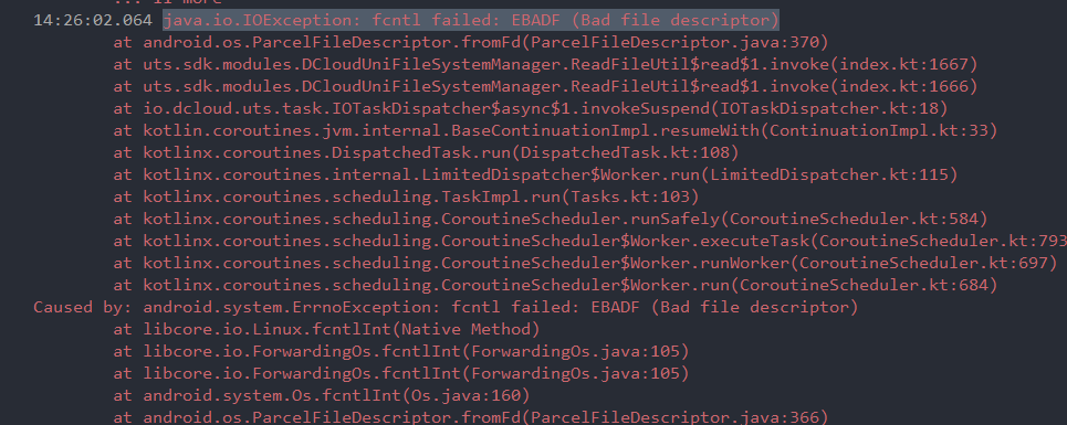 在大文件分片上传的时候,我需要获取每一片文件的数据信息,由此使用了uni.getFileSystemManager().read api去读取数据 但是读取每一片文件的时候,有的分片会报错 java.io.IOException: fcntl failed: EBADF (Bad file descriptor)