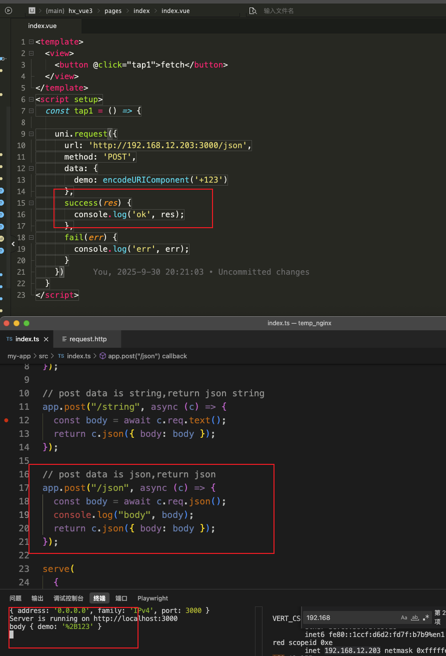 更新:data 参数不会参与额外的逻辑,我使用 encode 和不是用包装,运行到 iPhone 真机、h5 观察 network 和 服务端打印的参数都正常。请提供完整复现工程、服务端打印截图,自查是否有额外的插件、逻辑处理你的业务代码。
