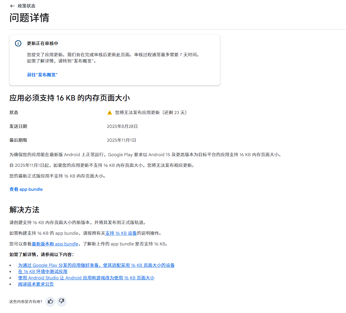 使用云打包上传到谷歌应用商店,出现责令整改要求支持16kb页面