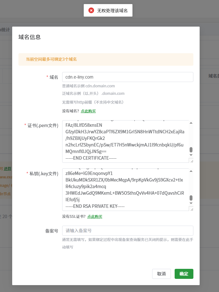 开通“云存储-七牛云”存储服务后,添加域名,报无权处理该域名,请问是什么原因啊?域名解析已按照开通引导完成解析。
