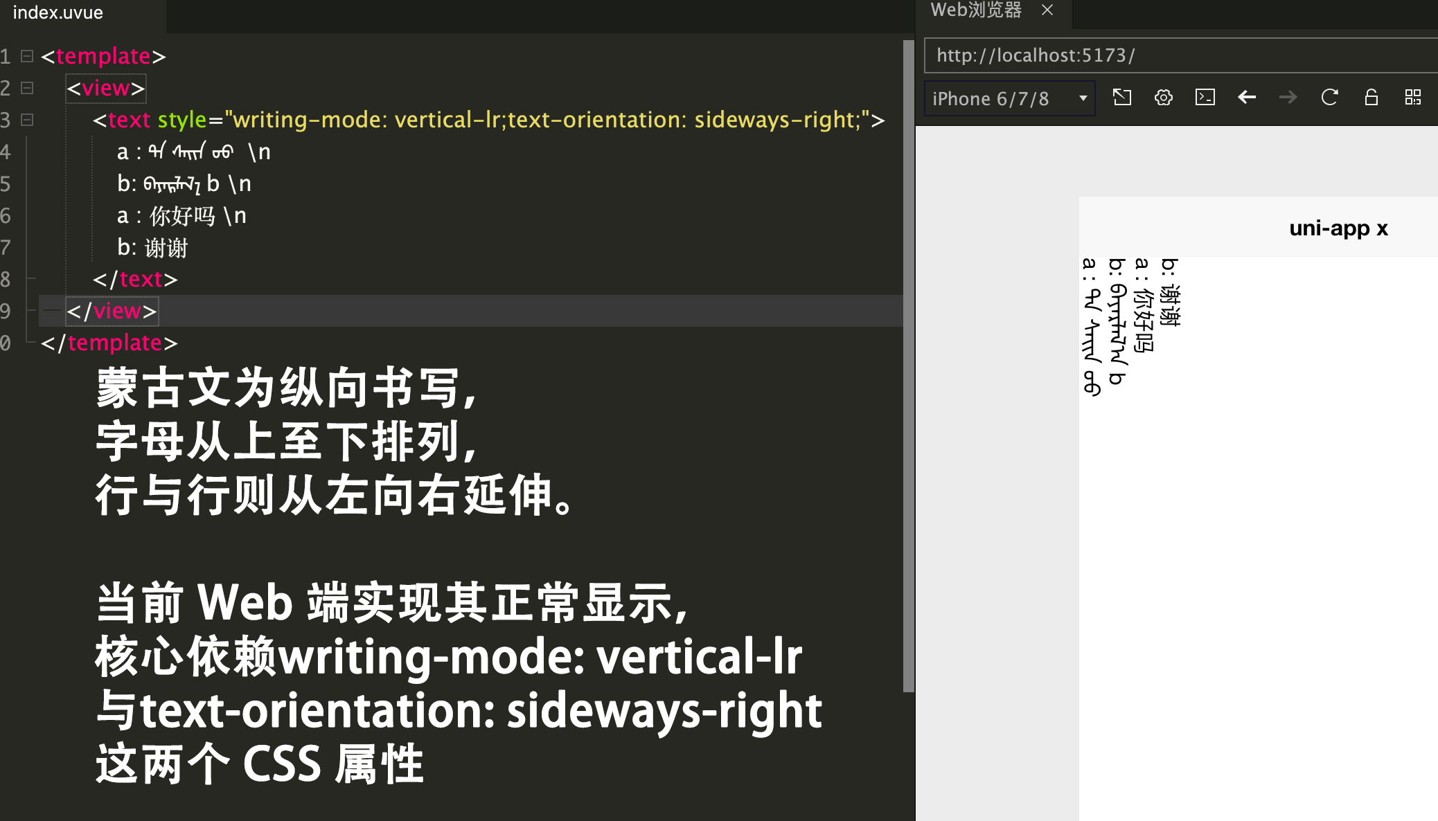 想进一步请教一下:由于writing-mode: vertical-lr和text-orientation: sideways-right是蒙古文纵向排版的核心依赖 —— 没有这两个属性,整个项目的蒙古文内容都无法正常显示,相当于直接阻断了蒙古文场景在 UniApp X 上的落地可能性。