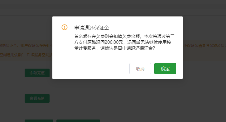 请先确保满足退还条件(删除所有阿里云按量计费空间/关闭腾讯云/支付宝云相关功能)