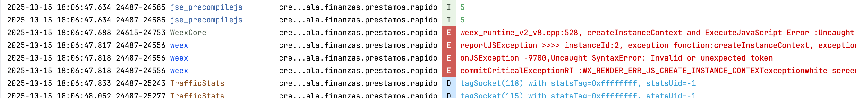 2025-10-15 18:06:47.817 24487-24556 weex cre...ala.finanzas.prestamos.rapido E reportJSException >>>> instanceId:2, exception function:createInstanceContext, exception:Uncaught SyntaxError: Invalid or unexpected token