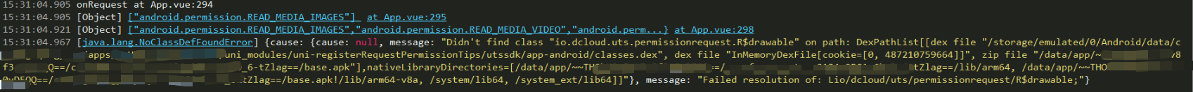 [java.lang.NoClassDefFoundError] {cause: {cause: null, message: "Didn't find class "io.dcloud.uts.permissionrequest.R$drawable" on path: DexPathList[[dex file "/storage/emulated/0/Android/data/XXX/apps/UNIXXXXXX/www/uni_modules/uni-registerRequestPermissionTips/utssdk/app-android/classes.dex", dex file "InMemoryDexFile[cookie=[0, 496012755264]]", zip file "/data/app/_uhxiq7fpWtayJLH9BSOTQ==/XXX-XXX==/base.apk"],nativeLibraryDirectories=[/data/app/_uhxiq7fpWtayJLH9BSOTQ==/XXX-XXX==/lib/arm64, /data/app/~~XXX==/XXX-_9pHBaEo2xKUASbAV5bb1Q==/base.apk!/lib/arm64-v8a, /system/lib64, /hw_product/lib64, /system/lib64/module/multimedia, /system/product/lib64]]"}, message: "Failed resolution of: Lio/dcloud/uts/permissionrequest/R$drawable;"}