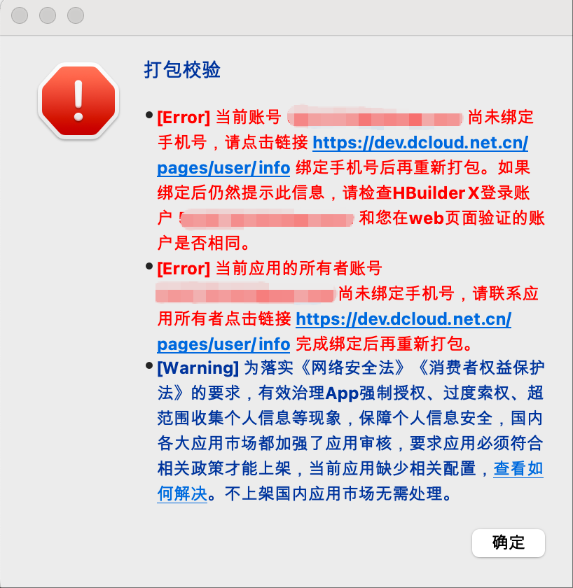但是使用HBuilderX打包app时,不管是云打包还是本地打包,都不停报错:当前账号尚未绑定手机号
