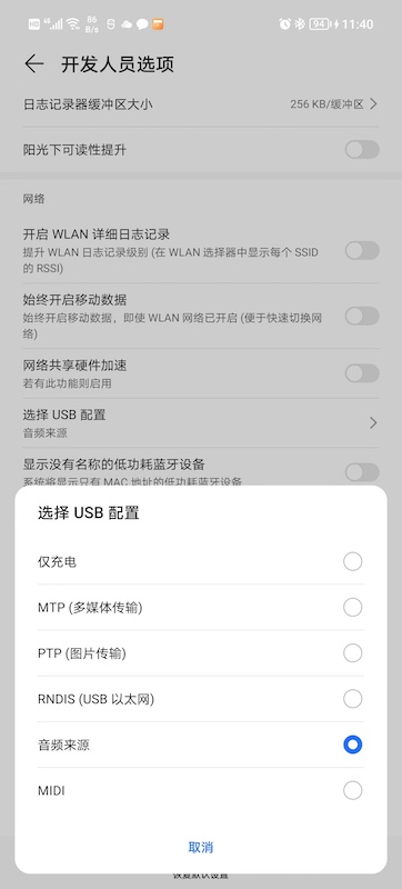问题机版本更新之后,不存在音频来源这个配置项,只有“仅充电”,“MTP(多媒体传输)”,"PTP(图片传输)","RNDIS(USB以太网)","MIDI"这几个,