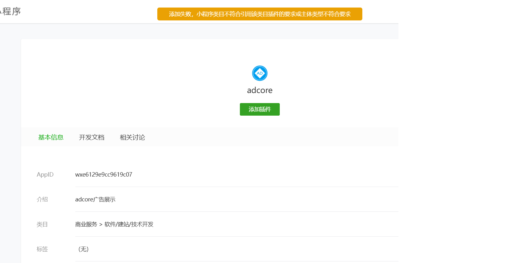 谢谢!我更新到最新版本后,确实不依赖珊瑚插件了。但是还有另外一个插件依赖:adcore,这个也是必须的吗?个人小程序也无法添加这个插件呢。