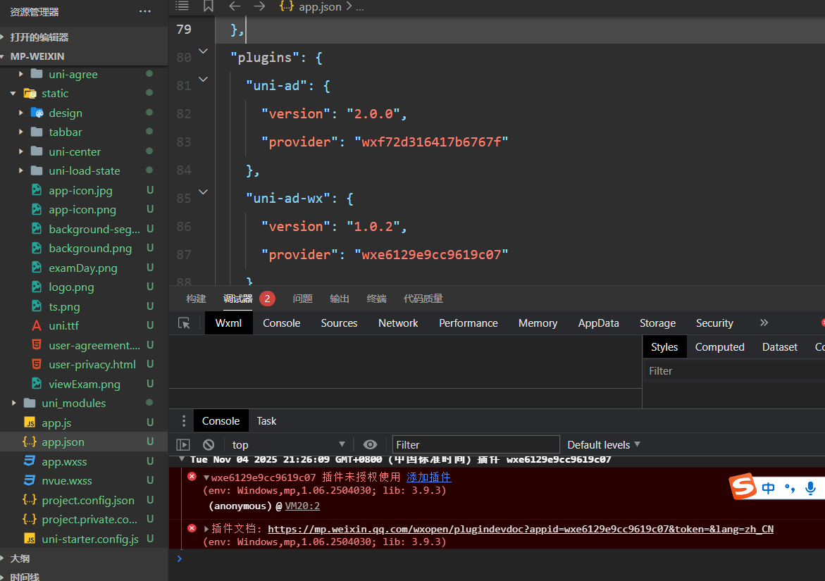 代码中使用了ad组件,用最新版HBuilderX4.84编译成微信小程序,依赖adcore插件。