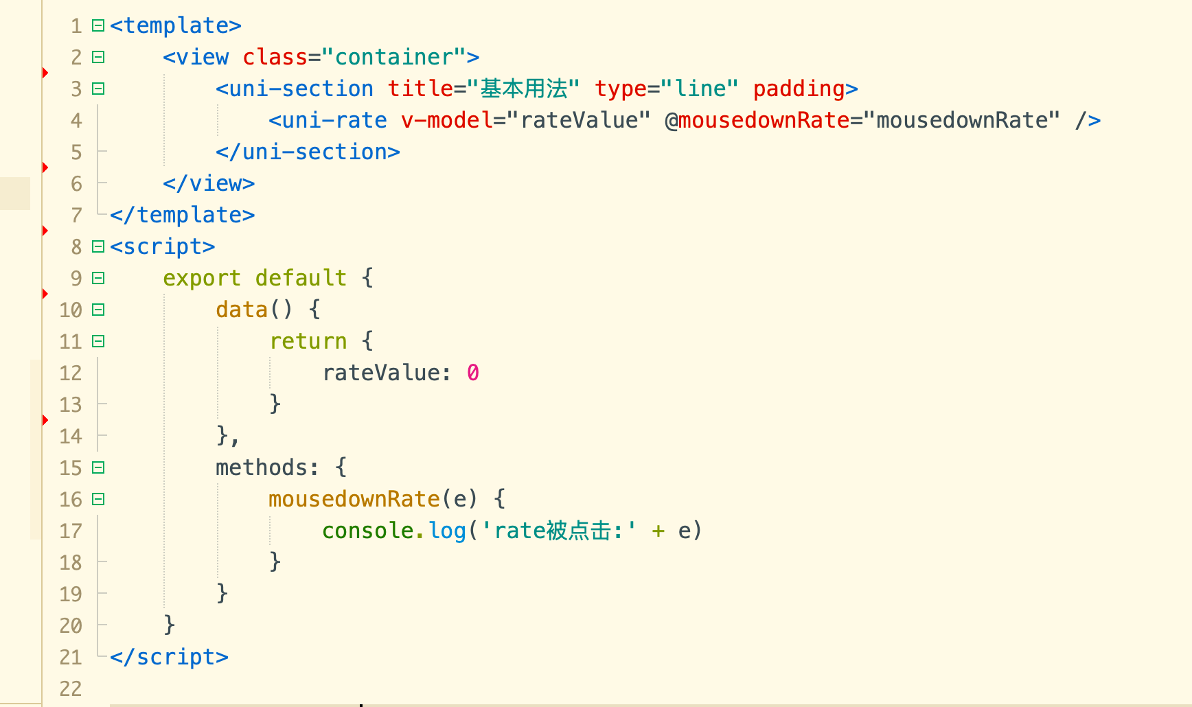 <uni-rate v-model="newRating" size="20" @change="onChange" touchable="false"/>