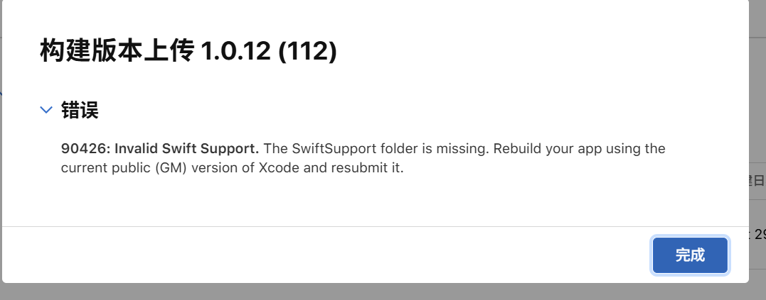 收到邮件提示:ITMS-90426: Invalid Swift Support - The SwiftSupport folder is missing. Rebuild your app using the current public (GM) version of Xcode and resubmit it