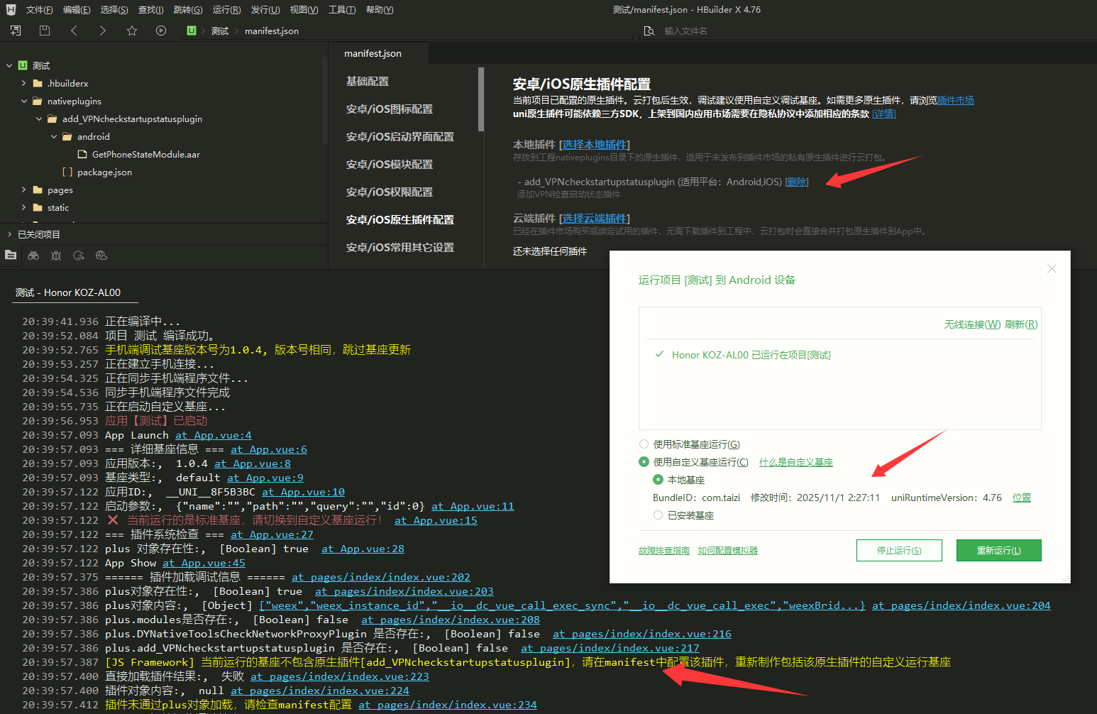 20:39:57.387 [JS Framework] 当前运行的基座不包含原生插件[add_VPNcheckstartupstatusplugin],请在manifest中配置该插件,重新制作包括该原生插件的自定义运行基座