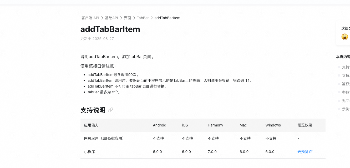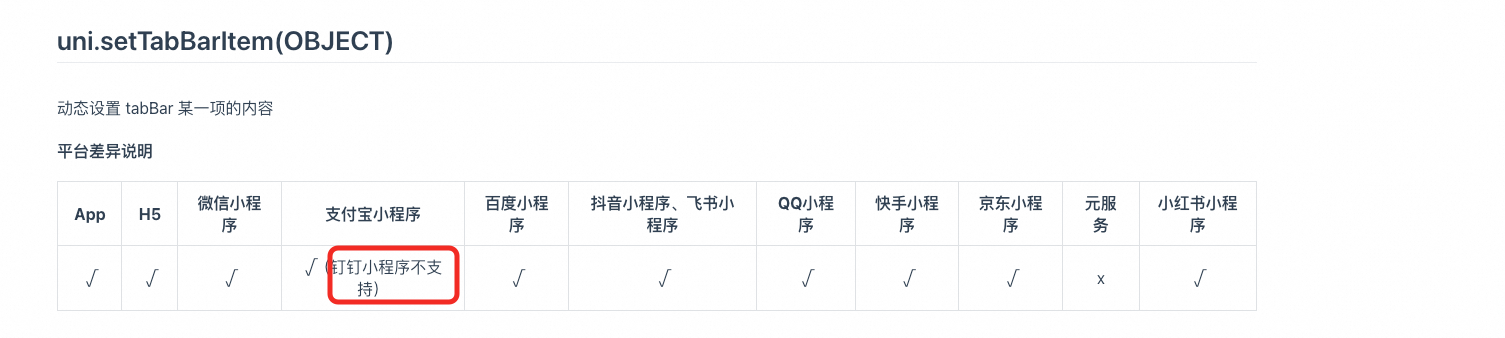 uni.setTabBarItem 在文档上写着 钉钉小程序不支持,但是钉钉小程序官方是有这个方法的,而且本人亲自使用过,能正常生效。故请教下,是这个方法已经可以用了,只是uni官方文档没有及时更新;还是说依旧不支持这个方法,不支持的原因是啥