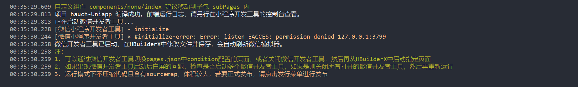 运行到微信小程序,无法自动开启微信开发者工具,提示:initialize-error: Error: listen EACCES: permission denied 127.0.0.1:3799,无法自动开启微信开发者工具,hbuilder已配置微信开发工具路径,微信开发工具已配置,并已开启服务端口