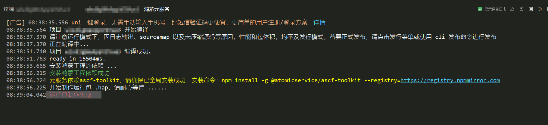 uniapp vue3转鸿蒙元服务 出现 运行包制作失败 无其他报错 也无具体日志 目前找不到原因 有方法可以看到具体日志吗?或者这种问题有什么解决办法呢? 控制台输出如下图 环境: HBuilder 4.76 鸿蒙deveco-studio-5.1.1.840 目前是运行到实体机上 鸿蒙系统版本5.1.0.150 sp15 将其使用app模式编译 可以运行 并无报错 但是 以元服务编译就不行 会报如图错误