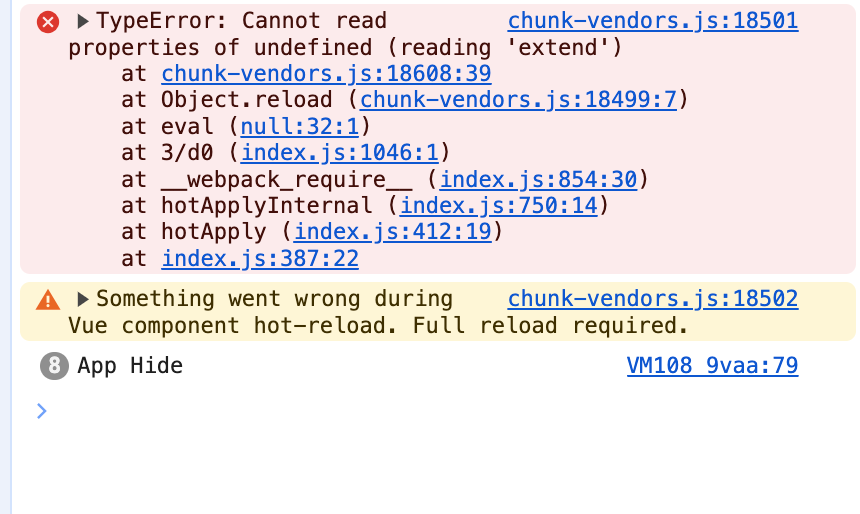 chunk-vendors.js:18502 Something went wrong during Vue component hot-reload. Full reload required.