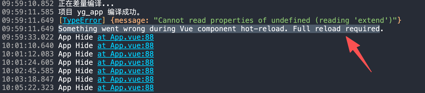 在App.vue 文件中,随意更改 console.log('App Hide12233') 保存时, 就会看到报错信息