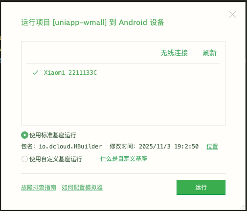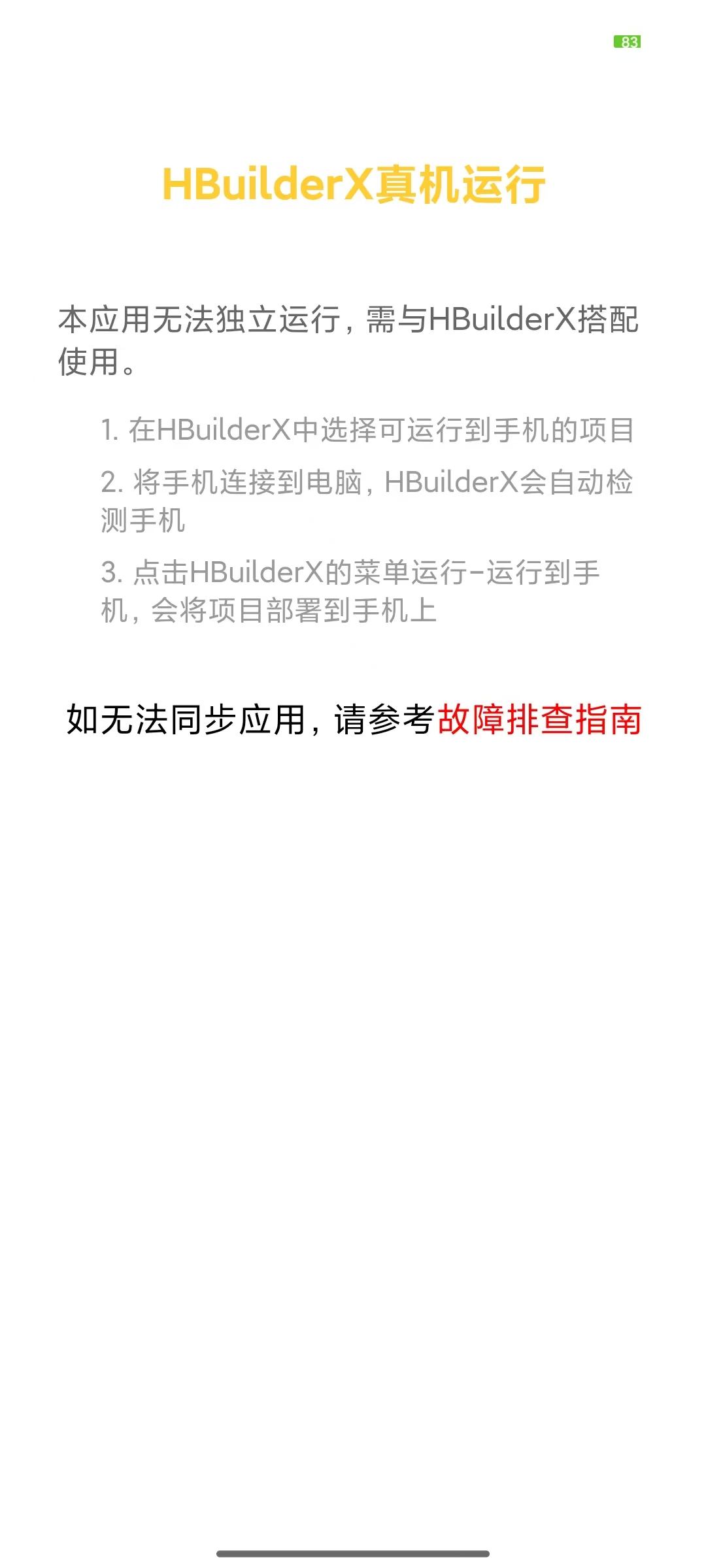 macbook pro 使用HBuilderX运行uniapp,连接安卓手机,标准基座运行,手机上页面提示‘本应用无法独立运行,需与HBuilderX搭配使用’,咋回事呢大佬们