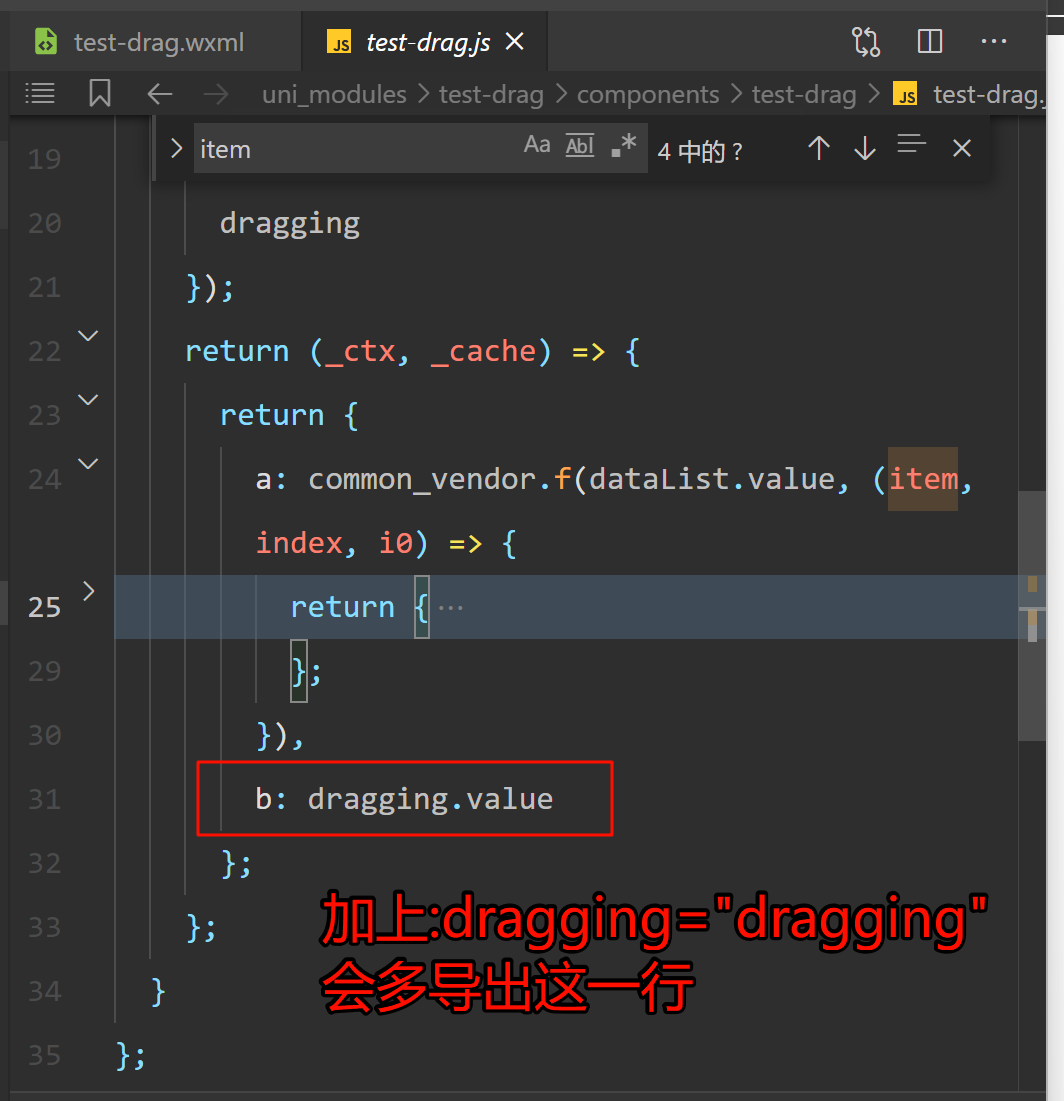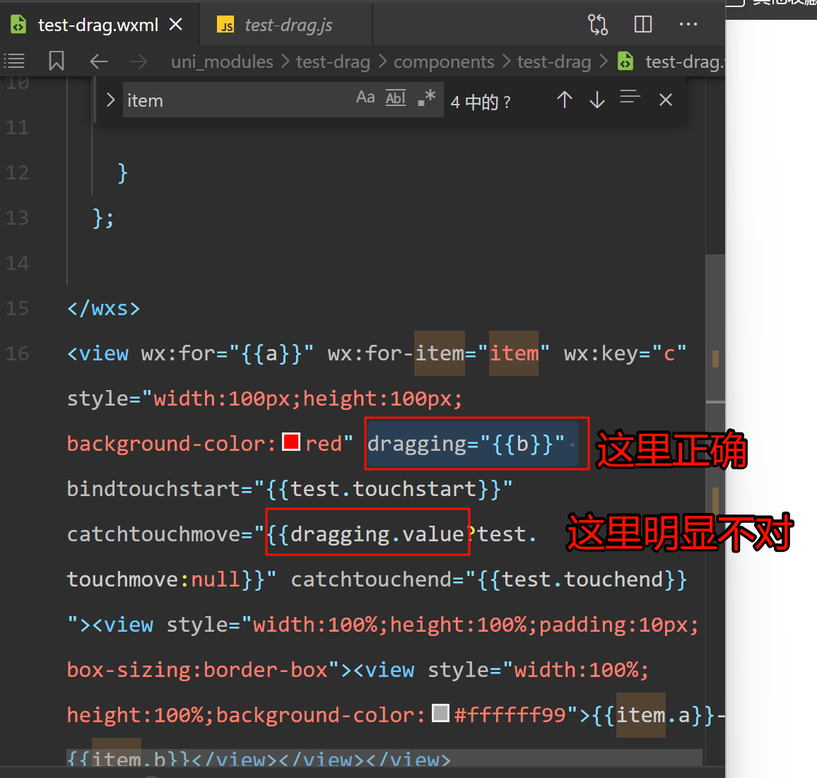 如果不加:dragging="dragging", 只有:catchtouchmove="dragging?test.touchmove:null" 甚至都不会映射dragging这个变量, 是不是没识别到