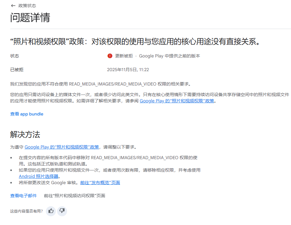 之前还好好的,最近发布的app都被拒绝了,提示这两个权限需要移除,由于使用次数和场景不太多,但是我在配置做了移除,谷歌还是扫描出来了,麻烦官方予以介入解决。这块已经直接导致无法上架最新版本的包了。是否有能解决办法,并且能兼容ios和安卓所有场景的使用。