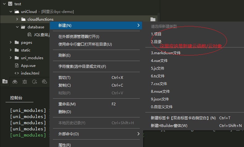 有单击unicloud下cloudfunction目录,应该有新建云函数菜单,但是我这里没有该菜单,,重建项目也不行。不知是什么原因