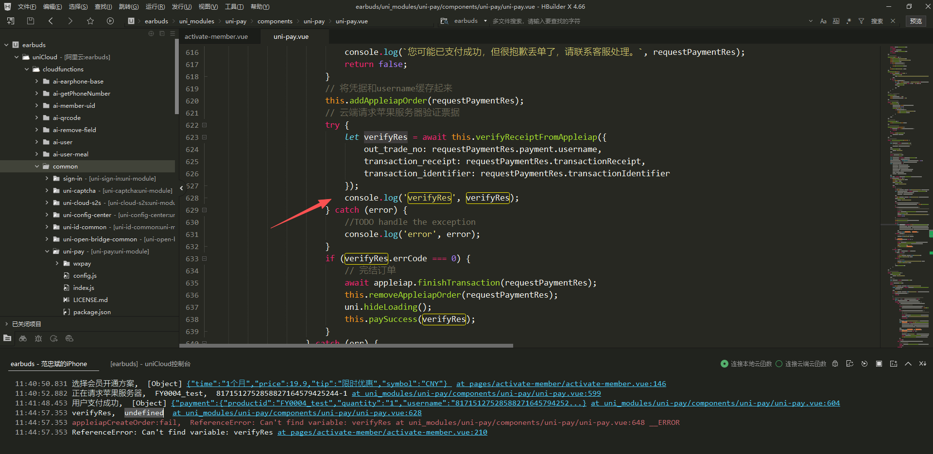 沙箱环境,使用uni-pay插件发起ios内购支付,没有触发到支付成功回调,调试发现verifyRes返回的是undefined,最终没有执行到verifyRes.errCode === 0部分的代码,什么原因如何解决?