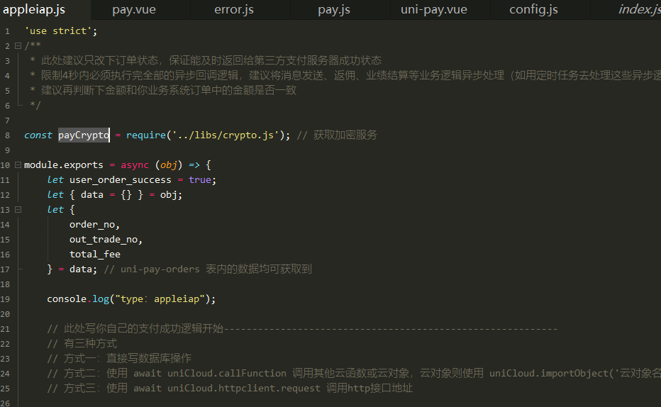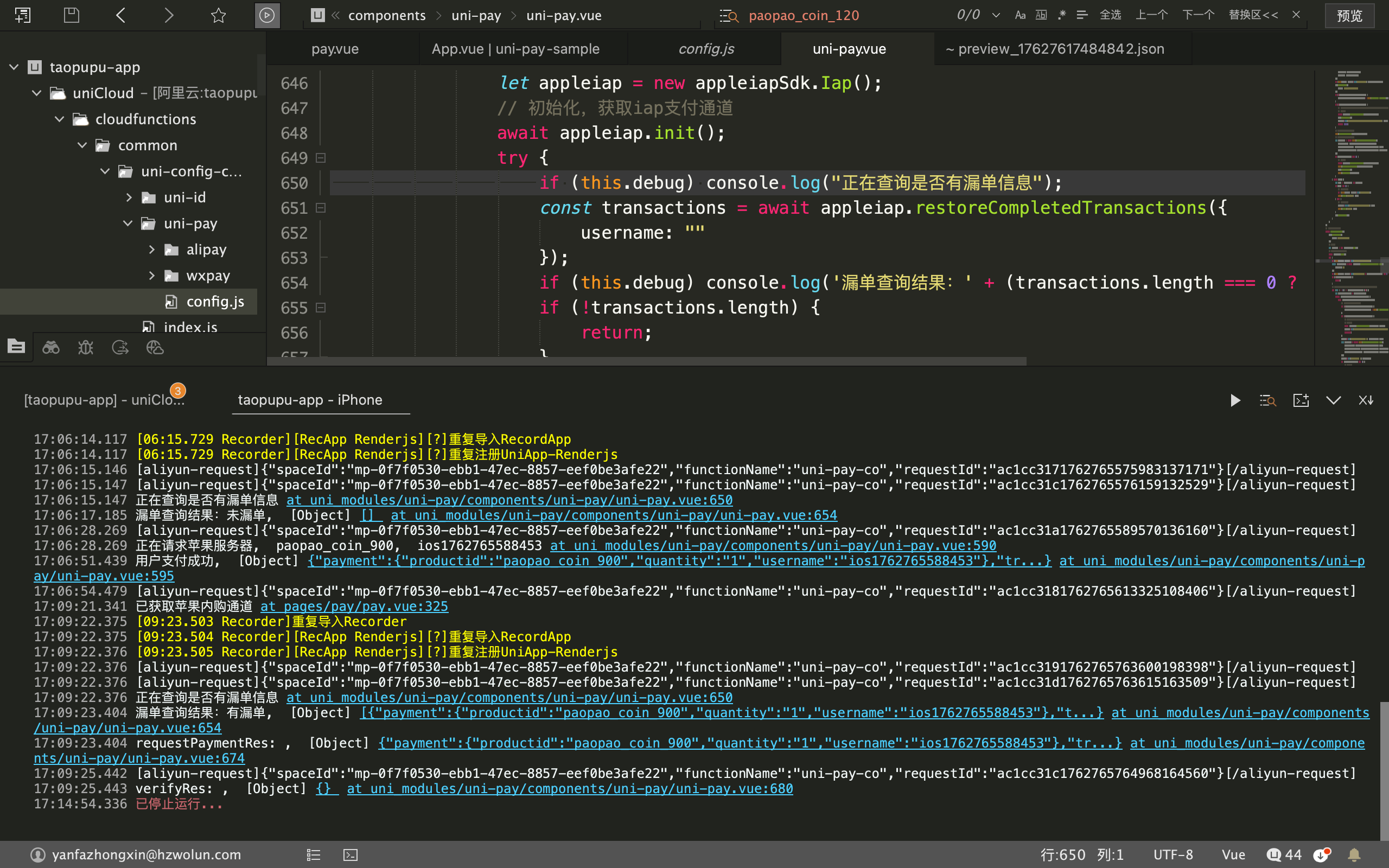 根据uni-pay组件提示配置好支付流程并且在、common/uni-config-center/uni-pay/config.js中设置沙箱模式为true,第一次调用后不触发@success事件,第二次再次调用verifyRes显示值为{},排查云端函数调用,verifyReceiptFromAppleiap方法,结果为:[uni-pay-co/ac1cc31c1762765764968164560/1821ms/ERROR] undefined