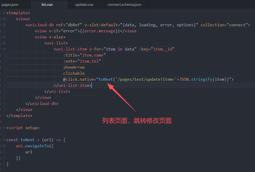 @click.native="toNext('/pages/test/update?item='+JSON.stringify(item))">