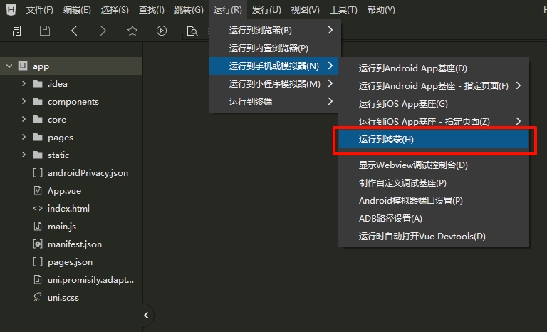 cli 项目编译app后在hbuilder里打开没有“运行到鸿蒙的菜单“。直接用Hbuilder建立的项目是有这个菜单的。