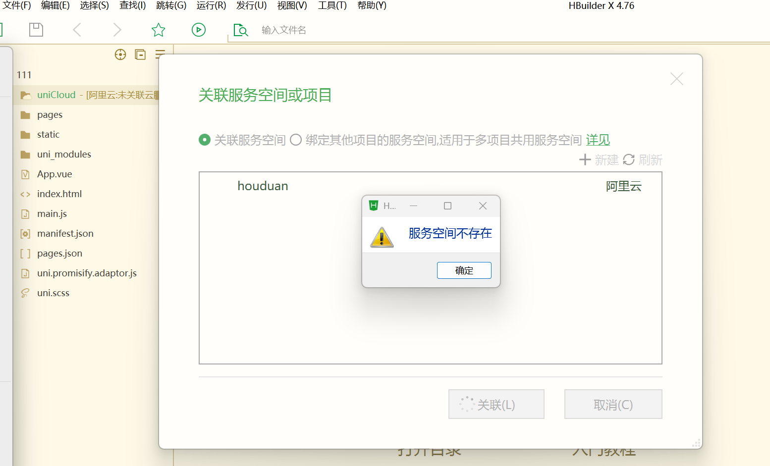 无法关联已经创建好的云服务空间,尝试关联后,会报错:“服务空间不存在”