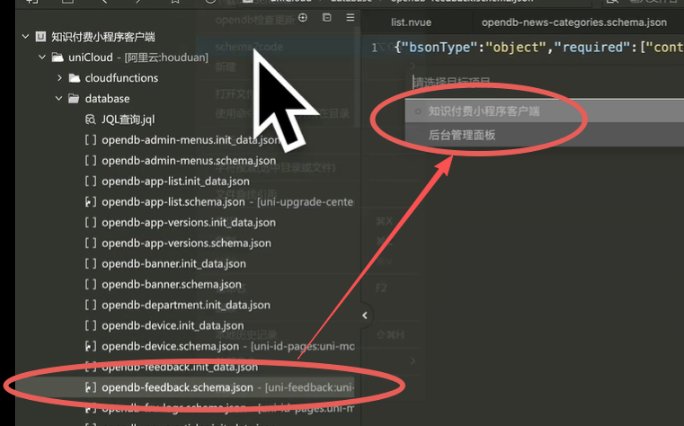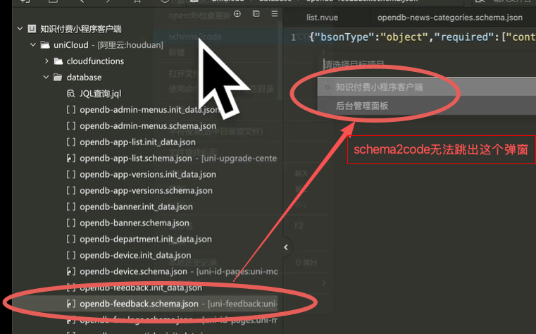 在后台项目的unicloud文件夹中,已经成功绑定了用户端项目的前提下,去用户端进行schema2code的操作