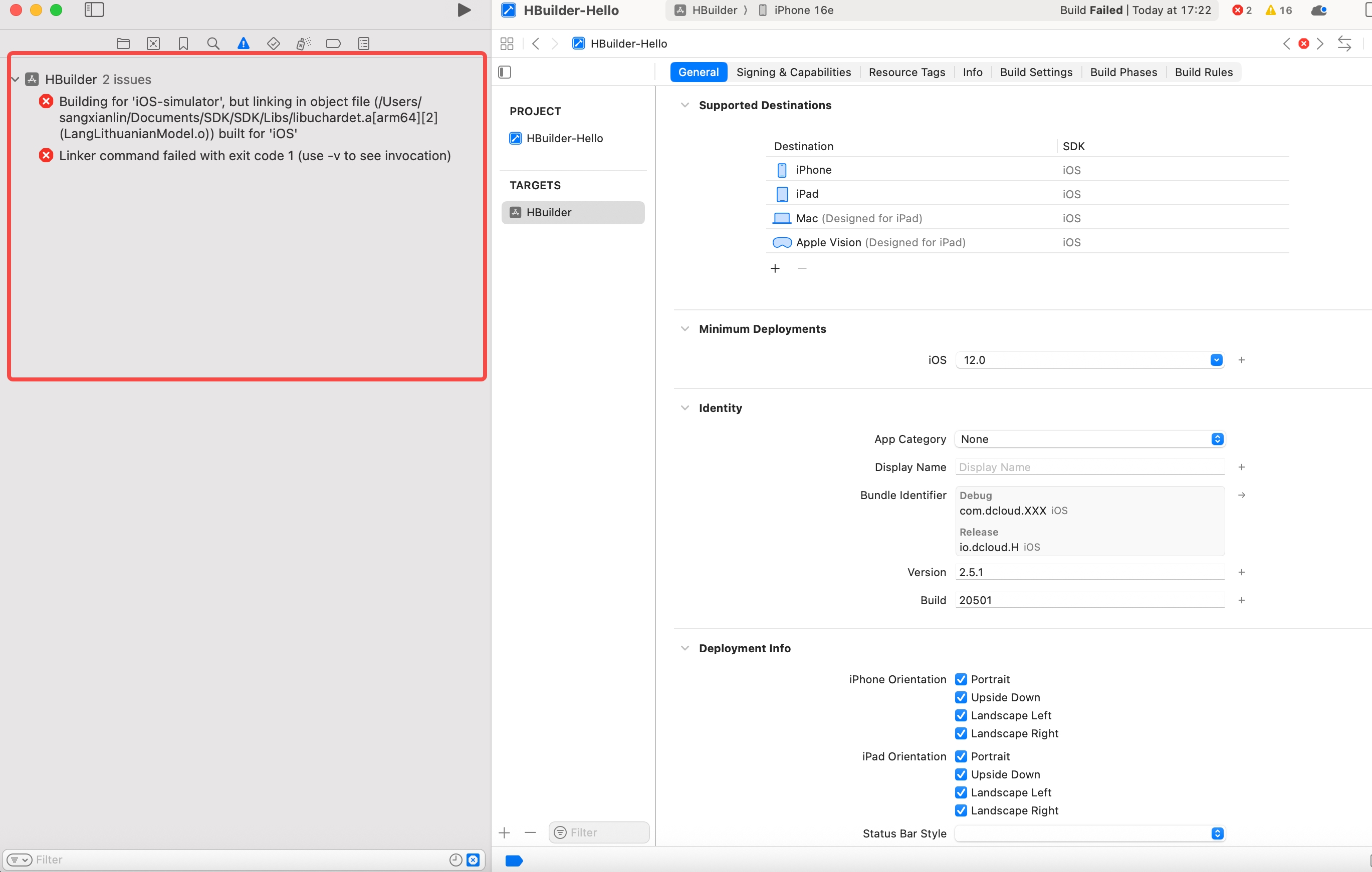 HBuilder 2 issues Building for 'iOS-simulator', but linking in object file (/Users/ sangxianlin/Documents/SDK/SDK/Libs/libuchardet.a[arm64][21 (LangLithuanianModel.o)) built for 'iOS' Linker command failed with exit code 1 (use -v to see invoccation)