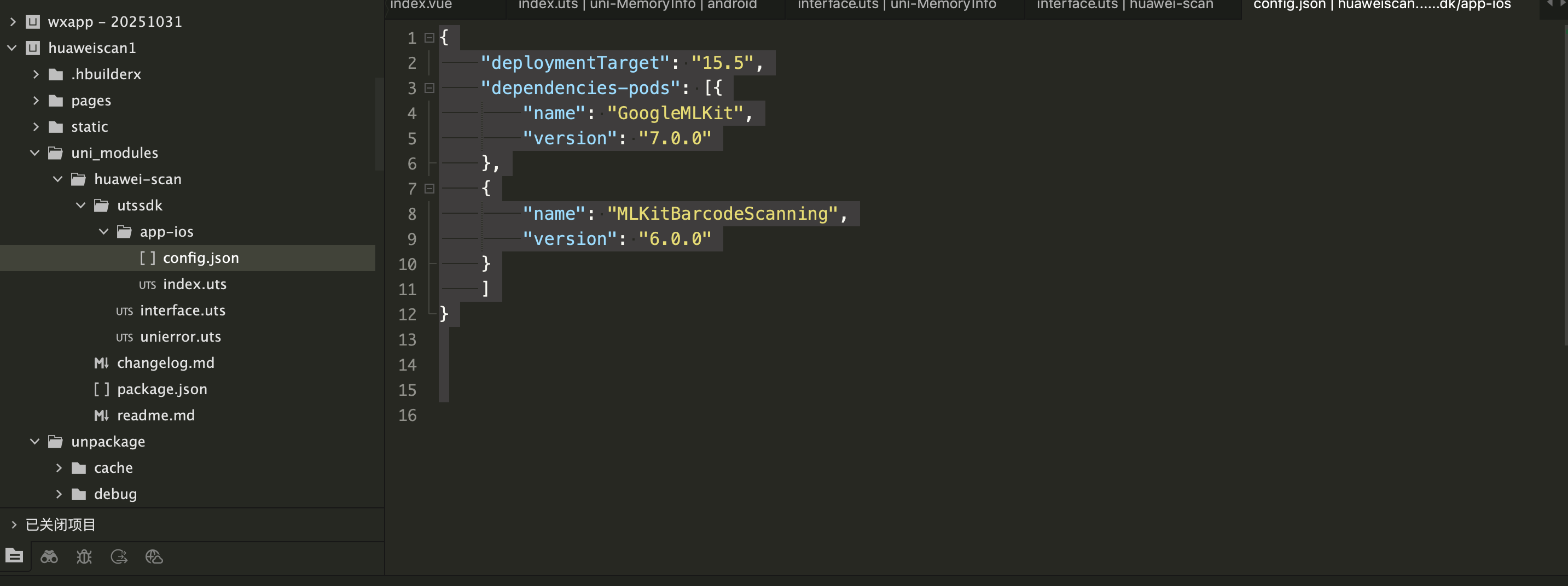 { "deploymentTarget": "15.5", "dependencies-pods": [{ "name": "GoogleMLKit/BarcodeScanning", "version": "6.0.0" }] } - 确保Xcode版本≥打包机环境(当前云打包Xcode版本见iOS平台云打包环境)