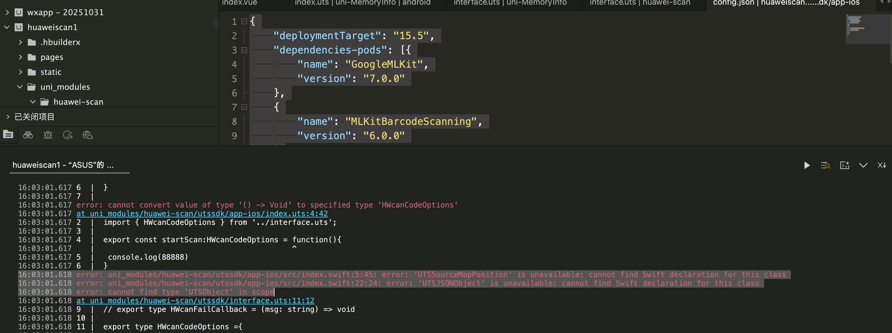 该错误通常由Swift库版本不兼容引起。根据知识库,uni-app x的uni-barcode-scanning模块(4.71+)明确依赖pod 'GoogleMLKit/BarcodeScanning', '~> 6.0.0',但您配置了GoogleMLKit 7.0.0(主版本升级可能导致API变更)。