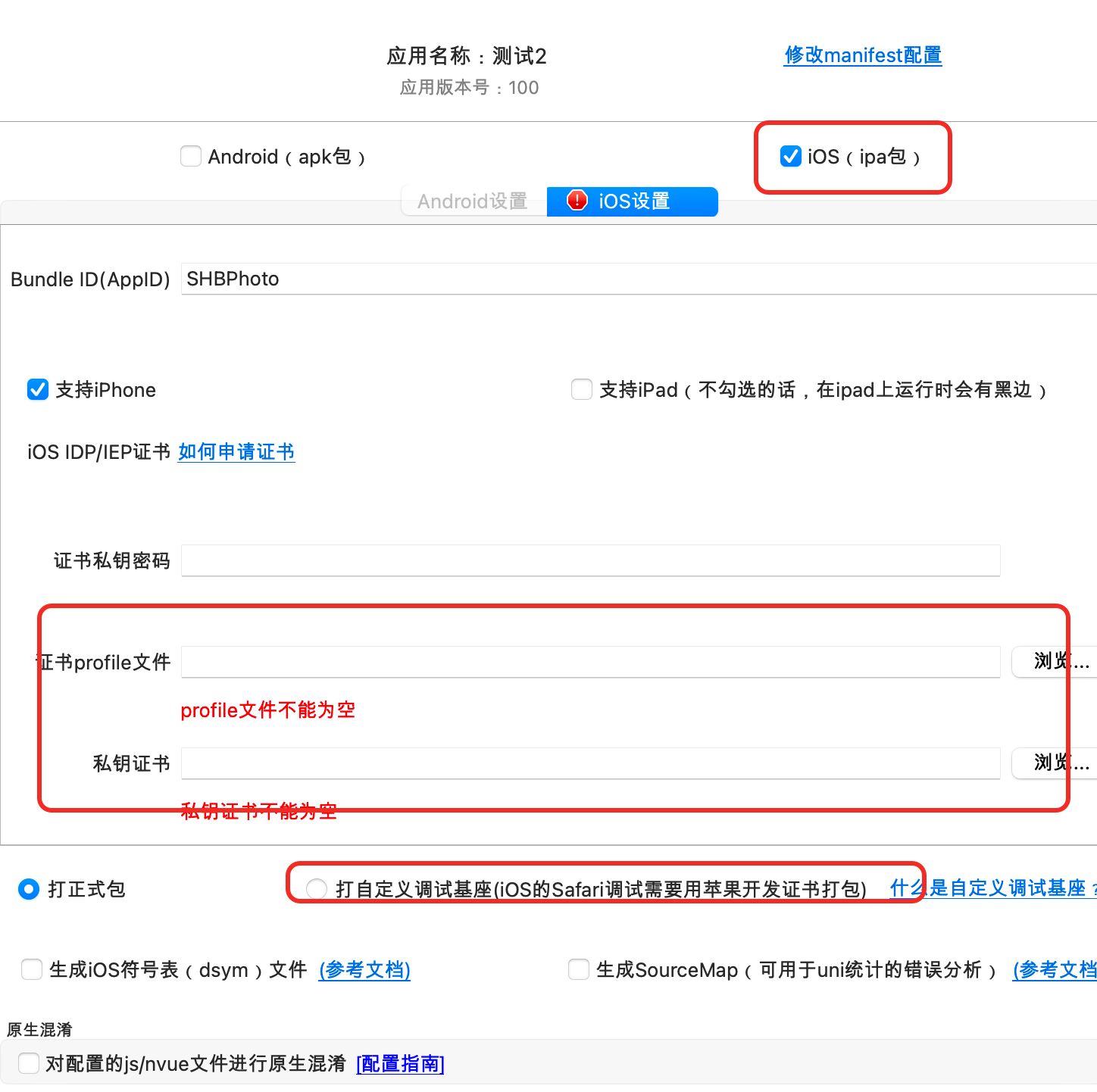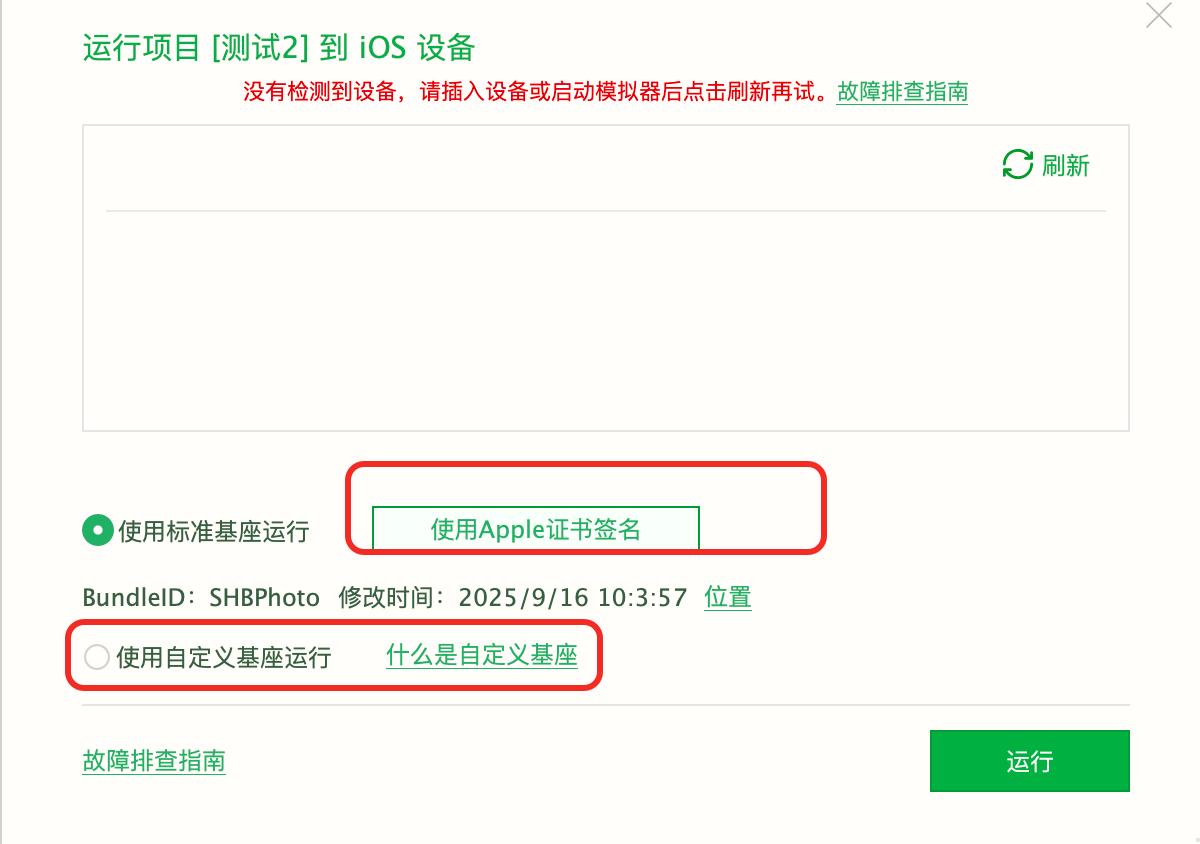 确认勾选了自定义基座;同样的 android 自定义基座没有问题